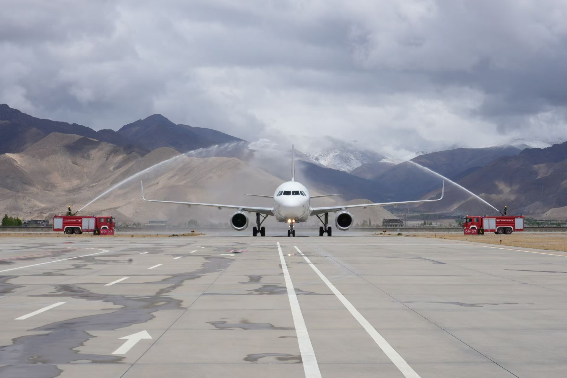 2025年5月1日,中國(guó)東航開通首條上海直飛日喀則的航線,該航線成為西藏支線機(jī)場(chǎng)連接上海的第一條直達(dá)空中通道,圖為日喀則機(jī)場(chǎng)以“水門儀式”迎接首航航班。