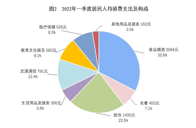 據(jù)悉,一季度,全國居民人均消費支出6393元,比上年名義增長6.9%,扣除價格因素影響,實際增長5.7%。分城鄉(xiāng)看,城鎮(zhèn)居民人均消費支出7924元,增長5.7%,扣除價格因素,實際增長4.4%;農(nóng)村居民人均消費支出4388元,增長8.6%,扣除價格因素,實際增長7.8%。一季度,全國居民人均食品煙酒消費支出2084元,增長4.9%,占人均消費支出的比重為32.6%;人均衣著消費支出453元,增長3.6%,占人均消費支出的比重為7.1%;人均居住消費支出1435元,增長6.7%,占人均消費支出的比重為22.5%;人均生活用品及服務消費支出356元,增長4.8%,占人均消費支出的比重為5.6%;人均交通通信消費支出791元,增長12.7%,占人均消費支出的比重為12.4%;人均教育文化娛樂消費支出583元,增長6.9%,占人均消費支出的比重為9.1%;人均醫(yī)療保健消費支出528元,增長9.1%,占人均消費支出的比重為8.3%;人均其他用品及服務消費支出163元,增長17.1%,占人均消費支出的比重為2.5%。