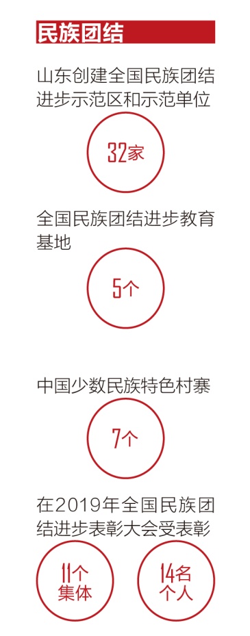 在全國(guó)率先啟動(dòng)民族團(tuán)結(jié)進(jìn)步和美家庭、示范崗位評(píng)選工作,營(yíng)造爭(zhēng)先創(chuàng)優(yōu)氛圍。連續(xù)21年開展民族團(tuán)結(jié)進(jìn)步宣傳月活動(dòng),成為民族團(tuán)結(jié)進(jìn)步宣傳教育的特色品牌。實(shí)施城市民族工作“十有”示范社區(qū)建設(shè),開展城市民族工作“紅石榴”品牌創(chuàng)建活動(dòng),青島市、煙臺(tái)市、濟(jì)南市歷下區(qū)先后被國(guó)家民委確定為全國(guó)少數(shù)民族流動(dòng)人口服務(wù)管理示范城市。截至目前,山東創(chuàng)建全國(guó)民族團(tuán)結(jié)進(jìn)步示范區(qū)和示范單位32家、全國(guó)民族團(tuán)結(jié)進(jìn)步教育基地5個(gè)、中國(guó)少數(shù)民族特色村寨7個(gè),在2019年全國(guó)民族團(tuán)結(jié)進(jìn)步表彰大會(huì)上有11個(gè)集體和14名個(gè)人受到表彰。