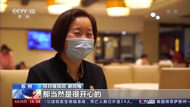 得月樓領(lǐng)班 謝尚梅:可以堂食可以上班了,當(dāng)然是很開(kāi)心的。這樣的話就多一份收入了,多點(diǎn)收入開(kāi)支上面也要富余一點(diǎn)。