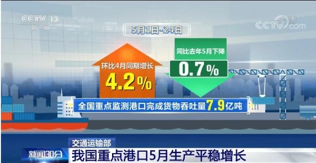 央視網(wǎng)消息:5月26日,交通運(yùn)輸部發(fā)布數(shù)據(jù)顯示,5月以來(lái),全國(guó)港口航道保持暢通,主要生產(chǎn)指標(biāo)穩(wěn)定向好。