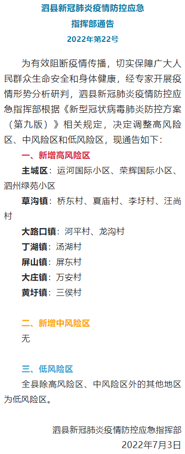 今日,安徽泗縣新冠肺炎疫情防控應急指揮部發(fā)布通告,全縣范圍內(nèi)新增13個高風險區(qū)。詳情如下:為有效阻斷疫情傳播,切實保障廣大人民群眾生命安全和身體健康,經(jīng)專家開展疫情形勢分析研判,泗縣新冠肺炎疫情防控應急指揮部根據(jù)《新型冠狀病毒肺炎防控方案(第九版)》相關規(guī)定,決定調(diào)整高風險區(qū)、中風險區(qū)和低風險區(qū),現(xiàn)通告如下:
