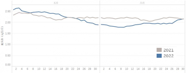 從價(jià)格走勢(shì)看(圖1),呈現(xiàn)三個(gè)特點(diǎn):一是整體處于低價(jià)區(qū)間。6月是我國(guó)露地蔬菜生產(chǎn)旺季,全國(guó)平均氣溫、平均降水量較常年同期偏高,平均日照時(shí)數(shù)較2021年偏多,整體有利于蔬菜生產(chǎn),供應(yīng)較為充足,月均地頭價(jià)環(huán)比、同比均呈下降態(tài)勢(shì)。二是月內(nèi)上旬呈下降趨勢(shì)。6月9日蔬菜地頭價(jià)1.78元/公斤,較月初1.90元/公斤下降了6.3%,跌至2022年以來(lái)的最低點(diǎn),比年內(nèi)最高價(jià)(4.21元/公斤)下降57.7%。三是中下旬價(jià)格止跌回升。經(jīng)歷6月10—16日和26—30日兩輪較大幅度上漲,月末價(jià)格達(dá)到2.16元/公斤,比6月9日價(jià)格上升了21.3%。上漲主要原因:一方面,黃淮海及環(huán)渤海等地區(qū)因持續(xù)高溫天氣,設(shè)施蔬菜提前拉秧,供應(yīng)量減少。另一方面,南方持續(xù)降雨影響蔬菜正常生長(zhǎng)和采收,江西、湖南、廣西、福建等省部分地區(qū)發(fā)生不同程度洪澇災(zāi)害,100多萬(wàn)畝蔬菜受災(zāi)。此外,受疫情影響的社會(huì)性消費(fèi)開始復(fù)蘇,蔬菜需求量增加。