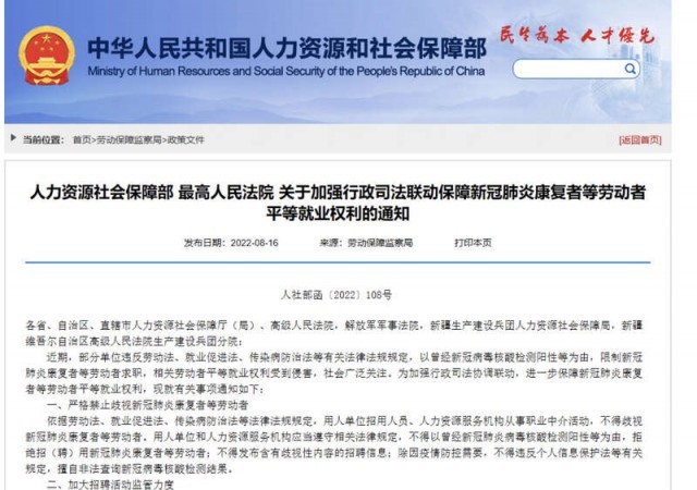 中國青年報客戶端北京8月16日電(中青報·中青網(wǎng)記者 李桂杰)人力資源和社會保障部、最高人民法院今天發(fā)布《關于加強行政司法聯(lián)動保障新冠肺炎康復者等勞動者平等就業(yè)權利的通知》(以下簡稱《通知》),再次重申嚴格禁止歧視新冠肺炎康復者等勞動者,并就加強就業(yè)歧視案件審理工作作出部署。