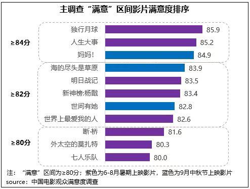 日前,由中國電影藝術(shù)研究中心聯(lián)合藝恩數(shù)據(jù)進(jìn)行的中國電影觀眾滿意度調(diào)查項(xiàng)目,對(duì)近三個(gè)月(6月15日-9月15日,涵蓋暑期及中秋節(jié))以來上映的15部影片進(jìn)行了觀眾滿意度調(diào)查。調(diào)研結(jié)果顯示,這15部影片中有13部進(jìn)入“滿意”區(qū)間(滿意度≥80分),其中主調(diào)查的13部影片綜合滿意度84.7分,在近一年調(diào)查的6個(gè)檔期中滿意度居于中間水平。
