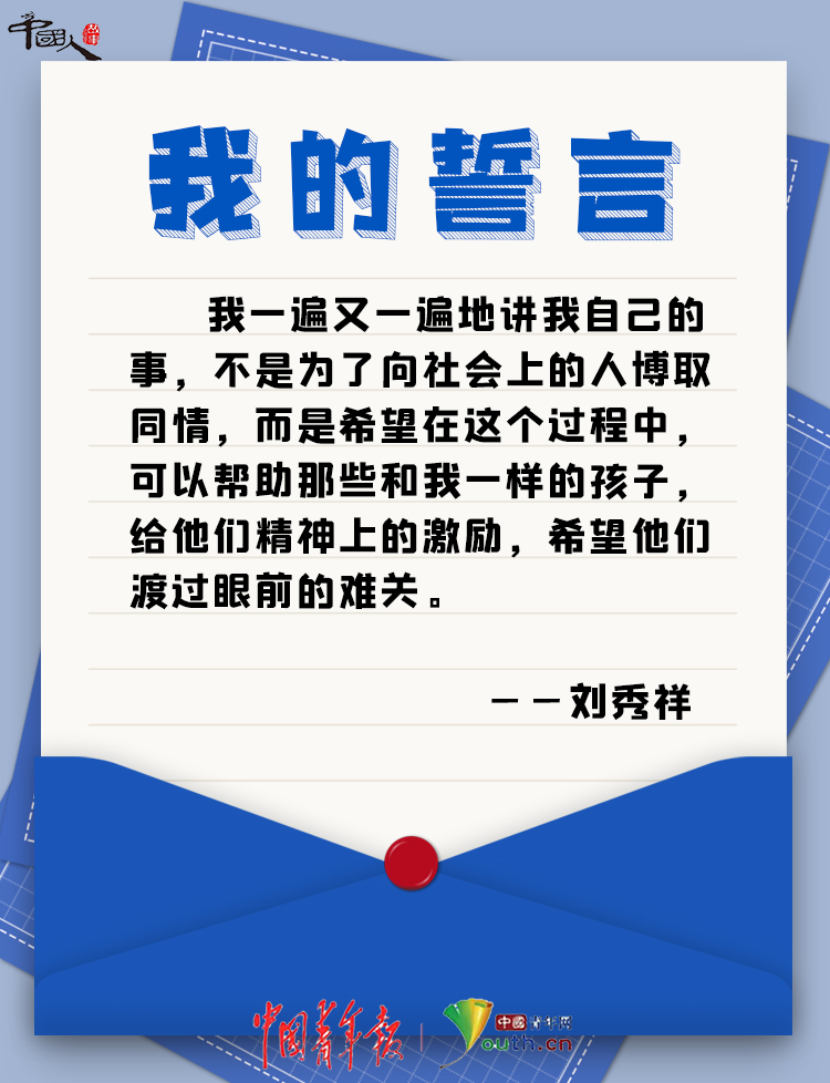 他說(shuō):“我一遍又一遍地講我自己的事,不是為了向社會(huì)上的人博取同情,而是希望在這個(gè)過(guò)程中,可以幫助那些和我一樣的孩子,給他們精神上的激勵(lì),希望他們渡過(guò)眼前的難關(guān)。”