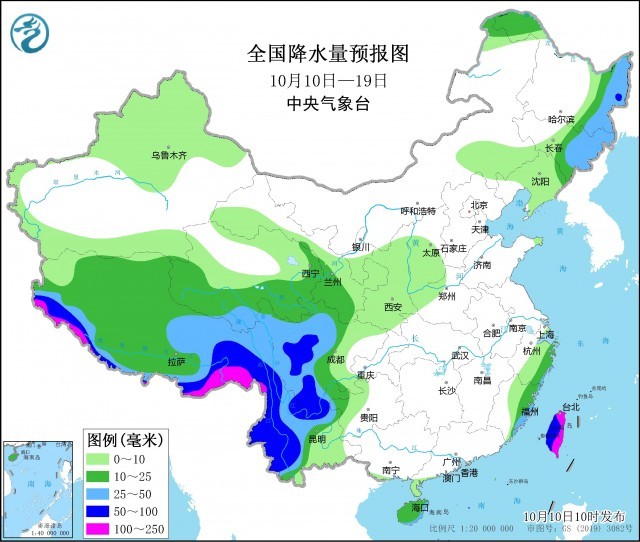 未來10天(10月10-19日),青藏高原東部和南部、四川盆地西部、云南西部和北部、貴州西北部、華南東部等地累計(jì)降水量有30~50毫米,部分地區(qū)有60~110毫米;上述地區(qū)累計(jì)降雨量較常年同期偏多5~8成,局地偏多1倍以上。黃淮、江淮、江南大部、華南大部多晴到多云天氣。