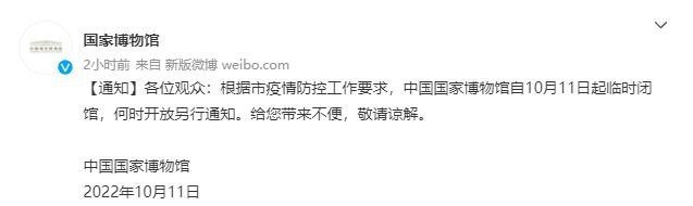 國家博物館10月10日發(fā)布通知稱,根據(jù)市疫情防控工作要求,中國國家博物館自10月11日起臨時(shí)閉館,何時(shí)開放另行通知。給您帶來不便,敬請諒解。