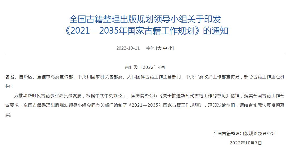 根據(jù)規(guī)劃,到2035年,古籍工作體制機(jī)制更加完善,標(biāo)準(zhǔn)規(guī)范體系基本健全,古籍保護(hù)、 整理研究和編輯出版成果豐碩,質(zhì)量明顯提升,古籍?dāng)?shù)字化資源建設(shè)取得重要進(jìn)展, 古籍普及深入推進(jìn),人才隊伍發(fā)展壯大,古籍工作在傳承和弘揚(yáng)中華優(yōu)秀傳統(tǒng)文化中的作用更加突出。