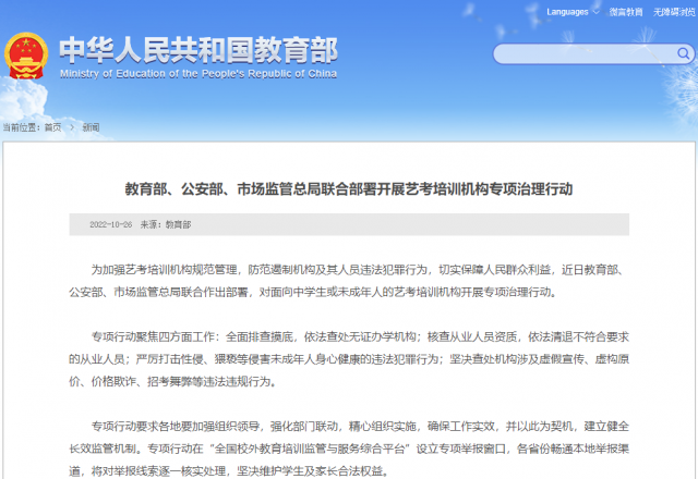 據(jù)教育部網(wǎng)站消息,為加強(qiáng)藝考培訓(xùn)機(jī)構(gòu)規(guī)范管理,防范遏制機(jī)構(gòu)及其人員違法犯罪行為,切實(shí)保障人民群眾利益,近日教育部、公安部、市場監(jiān)管總局聯(lián)合作出部署,對面向中學(xué)生或未成年人的藝考培訓(xùn)機(jī)構(gòu)開展專項(xiàng)治理行動(dòng)。