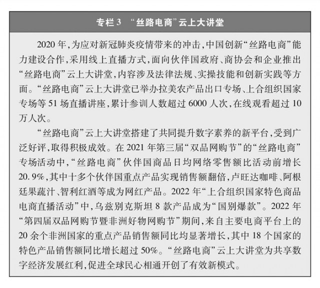 “絲路電商”合作成果豐碩。自2016年以來,中國(guó)與五大洲23個(gè)國(guó)家建立雙邊電子商務(wù)合作機(jī)制,建立中國(guó)-中東歐國(guó)家、中國(guó)-中亞五國(guó)電子商務(wù)合作對(duì)話機(jī)制,通過政企對(duì)話、聯(lián)合研究、能力建設(shè)等推動(dòng)多層次交流合作,營(yíng)造良好發(fā)展環(huán)境,構(gòu)建數(shù)字合作格局。電子商務(wù)企業(yè)加速“出?!保瑤?dòng)跨境物流、移動(dòng)支付等各領(lǐng)域?qū)崿F(xiàn)全球發(fā)展。積極參與世界貿(mào)易組織、二十國(guó)集團(tuán)、亞太經(jīng)合組織、金磚國(guó)家、上合組織等多邊和區(qū)域貿(mào)易機(jī)制下的電子商務(wù)議題討論,與自貿(mào)伙伴共同構(gòu)建高水平數(shù)字經(jīng)濟(jì)規(guī)則。電子商務(wù)國(guó)際規(guī)則構(gòu)建取得突破,區(qū)域全面經(jīng)濟(jì)伙伴關(guān)系協(xié)定電子商務(wù)章節(jié)成為目前覆蓋區(qū)域最廣、內(nèi)容全面、水平較高的電子商務(wù)國(guó)際規(guī)則。
