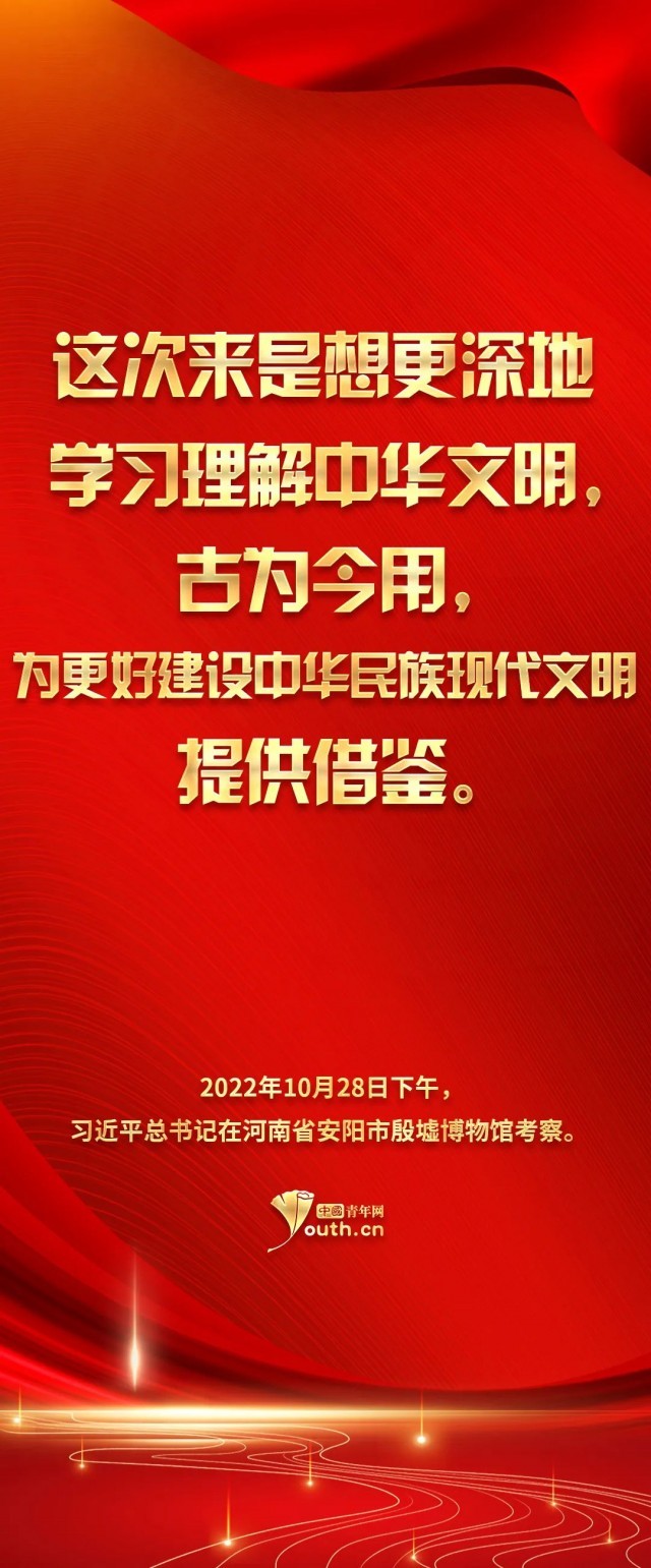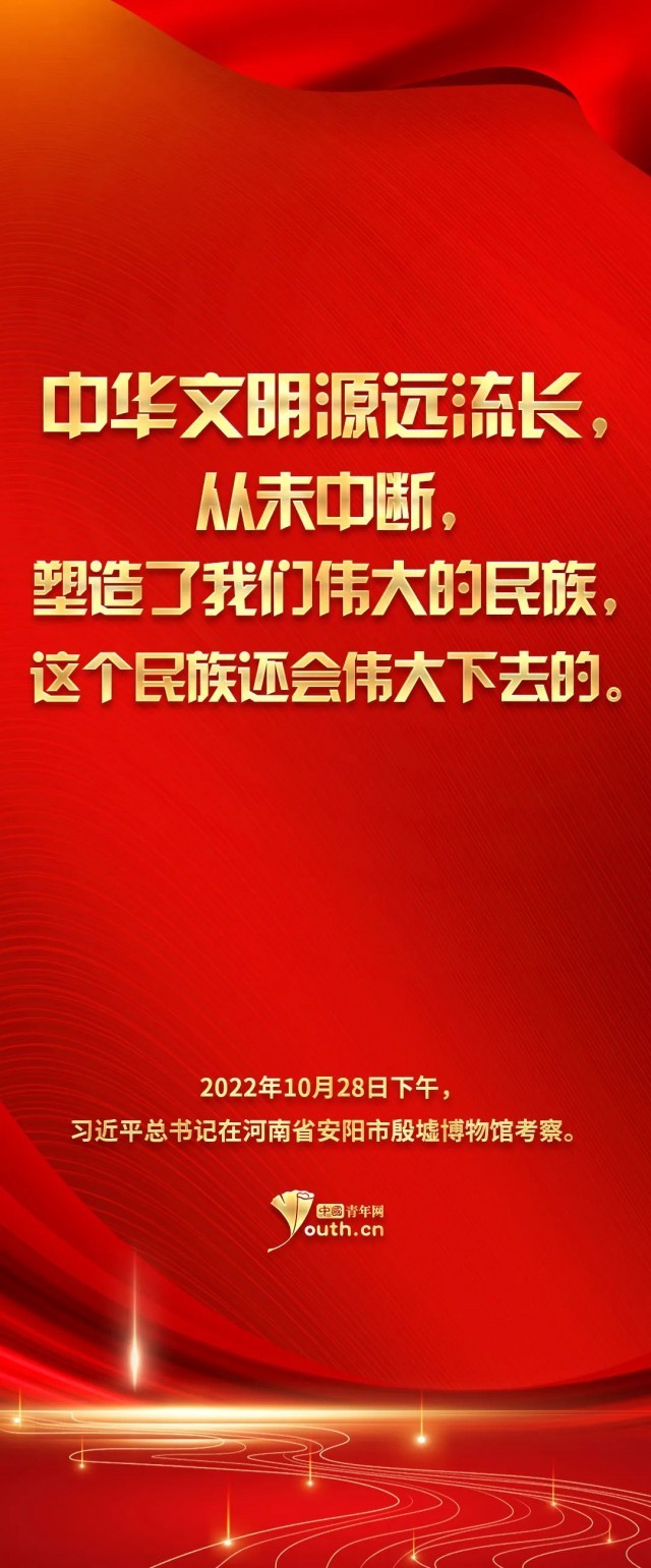 習(xí)近平總書記在殷墟考察時(shí)談道,“這次來是想更深地學(xué)習(xí)理解中華文明,古為今用,為更好建設(shè)中華民族現(xiàn)代文明提供借鑒。”殷墟出土的甲骨文為我們保存3000年前的文字,把中國(guó)信史向上推進(jìn)了約1000年。求木之長(zhǎng)者,必固其根本;欲流之遠(yuǎn)者,必浚其泉源。中華文明源遠(yuǎn)流長(zhǎng),從未中斷,塑造了我們偉大的民族。傳統(tǒng)文化“火種”需要代代傳承,用發(fā)展的眼光看待傳統(tǒng)文化,可以使“老樹發(fā)新芽”,激發(fā)傳統(tǒng)文化生命力,與新時(shí)代同頻共振。時(shí)代之筆的揮寫,不僅呈現(xiàn)中華民族的心靈圖譜,更為我們樹立文化自信、堅(jiān)定文化自信奠定了基礎(chǔ)。