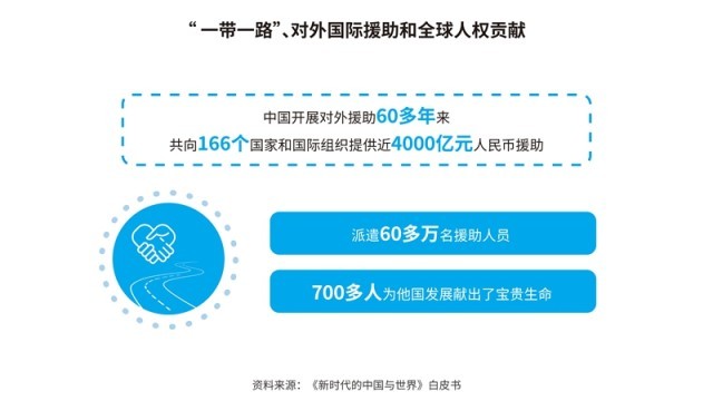 中國先后批準或加入了30余項國際人權(quán)文書,其中包括6項聯(lián)合國核心人權(quán)條約;累計共向166個國家和國際組織提供了援助,派遣60多萬名援助人員;多次無條件免除重債窮國和最不發(fā)達國家對華到期政府無息貸款債務(wù)。在聯(lián)合國維和行動中,中國是安理會常任理事國第一大出兵國,30多年來累計派出維和官兵5萬余人次。共建“一帶一路”已成為助力各國發(fā)展、深受世界歡迎的新興國際公共產(chǎn)品,據(jù)世界銀行研究報告,到2030年,將使相關(guān)國家760萬人擺脫極端貧困、3200萬人擺脫中度貧困。新冠肺炎疫情暴發(fā)以來,中國努力促進新冠疫苗在全球范圍內(nèi)公平合理分配,成為全球?qū)ν馓峁┮呙鐢?shù)量最多的國家。