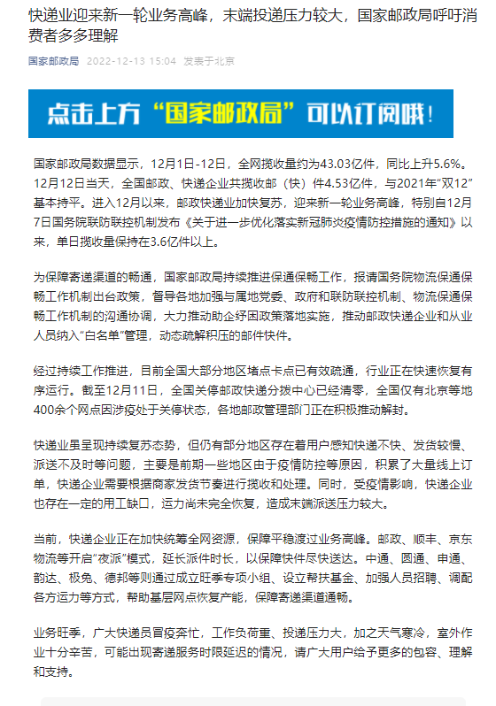 據(jù)“國(guó)家郵政局”公眾號(hào)13日消息,當(dāng)前,快遞企業(yè)正在加快統(tǒng)籌全網(wǎng)資源,保障平穩(wěn)渡過業(yè)務(wù)高峰。郵政、順豐、京東物流等開啟“夜派”模式,延長(zhǎng)派件時(shí)長(zhǎng),以保障快件盡快送達(dá)。中通、圓通、申通、韻達(dá)、極兔、德邦等則通過成立旺季專項(xiàng)小組、設(shè)立幫扶基金、加強(qiáng)人員招聘、調(diào)配各方運(yùn)力等方式,幫助基層網(wǎng)點(diǎn)恢復(fù)產(chǎn)能,保障寄遞渠道通暢。(中新財(cái)經(jīng))