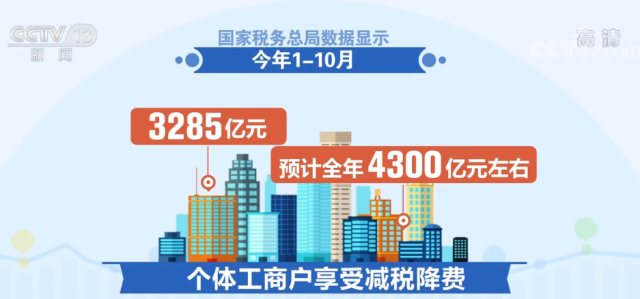 國(guó)家稅務(wù)總局?jǐn)?shù)據(jù)顯示,今年1—10月,個(gè)體工商戶享受減稅降費(fèi)3285億元,預(yù)計(jì)全年4300億元左右,隨著“六稅兩費(fèi)”減征政策進(jìn)一步擴(kuò)圍至個(gè)體工商戶,稅費(fèi)優(yōu)惠政策已覆蓋全部個(gè)體工商戶。