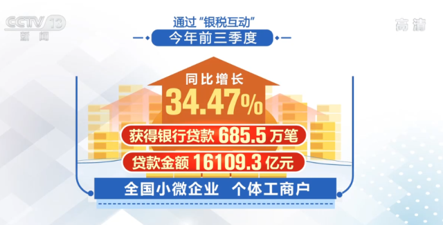 國(guó)家稅務(wù)總局?jǐn)?shù)據(jù)顯示,通過“銀稅互動(dòng)”,今年前三季度,全國(guó)小微企業(yè)、個(gè)體工商戶獲得銀行貸款685.5萬筆,貸款金額16109.3億元,同比增長(zhǎng)34.47%。