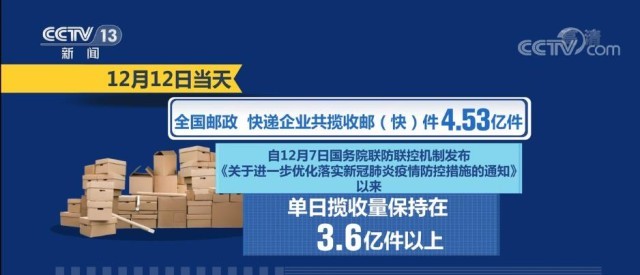 國家郵政局數(shù)據(jù)顯示,12月1日—12日,郵政快遞行業(yè)攬收量約為43.03億件,同比上升5.6%。12月12日當天,全國郵政、快遞企業(yè)共攬收郵(快)件4.53億件。自12月7日國務院聯(lián)防聯(lián)控機制發(fā)布《關于進一步優(yōu)化落實新冠肺炎疫情防控措施的通知》以來,單日攬收量保持在3.6億件以上。