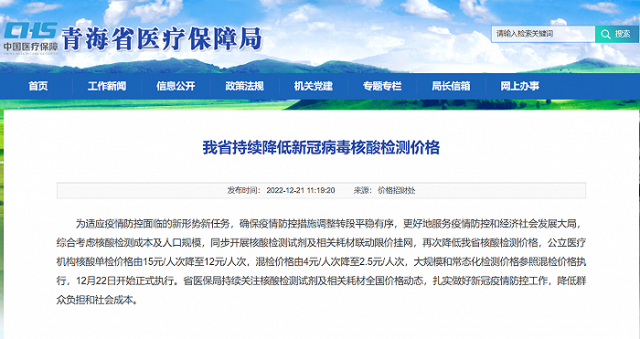 據(jù)青海省醫(yī)療保障局網(wǎng)站消息,為適應(yīng)疫情防控面臨的新形勢(shì)新任務(wù),確保疫情防控措施調(diào)整轉(zhuǎn)段平穩(wěn)有序,更好地服務(wù)疫情防控和經(jīng)濟(jì)社會(huì)發(fā)展大局,綜合考慮核酸檢測(cè)成本及人口規(guī)模,同步開(kāi)展核酸檢測(cè)試劑及相關(guān)耗材聯(lián)動(dòng)限價(jià)掛網(wǎng),再次降低青海省核酸檢測(cè)價(jià)格,公立醫(yī)療機(jī)構(gòu)核酸單檢價(jià)格由15元/人次降至12元/人次,混檢價(jià)格由4元/人次降至2.5元/人次,大規(guī)模和常態(tài)化檢測(cè)價(jià)格參照混檢價(jià)格執(zhí)行,12月22日開(kāi)始正式執(zhí)行。省醫(yī)保局持續(xù)關(guān)注核酸檢測(cè)試劑及相關(guān)耗材全國(guó)價(jià)格動(dòng)態(tài),扎實(shí)做好新冠疫情防控工作,降低群眾負(fù)擔(dān)和社會(huì)成本。