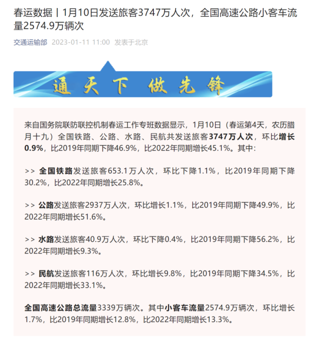 來自國務院聯(lián)防聯(lián)控機制春運工作專班數(shù)據(jù)顯示,1月10日(春運第4天,農(nóng)歷臘月十九)全國鐵路、公路、水路、民航共發(fā)送旅客3747萬人次,環(huán)比增長0.9%,比2019年同期下降46.9%,比2022年同期增長45.1%。其中:
