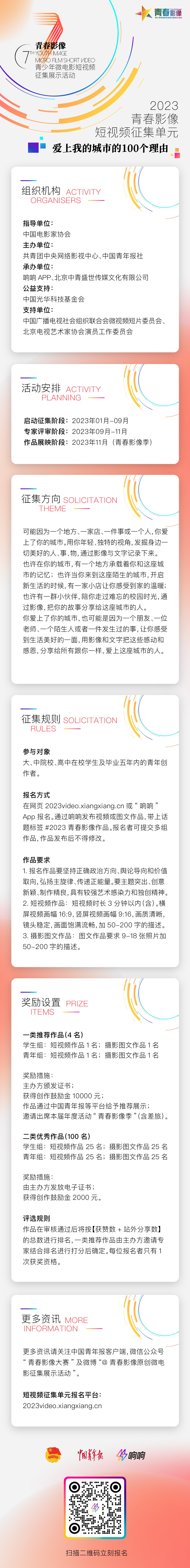 2022年12月31日,在中國電影家協(xié)會(huì)的指導(dǎo)下,由共青團(tuán)中央網(wǎng)絡(luò)影視中心、中國青年報(bào)社、珠海奇妙科技有限公司等單位組織開展的第七屆青春影像——“愛上我的城市的100個(gè)理由”短視頻征集單元正式啟動(dòng)!