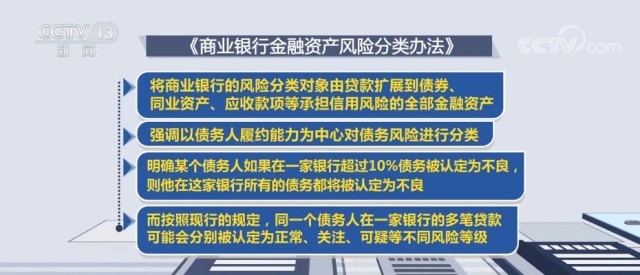 央視網(wǎng)消息:銀保監(jiān)會(huì)、中國(guó)人民銀行制定《商業(yè)銀行金融資產(chǎn)風(fēng)險(xiǎn)分類辦法》,于2月11日正式對(duì)外發(fā)布。推動(dòng)商業(yè)銀行加強(qiáng)信用風(fēng)險(xiǎn)管理、提升服務(wù)實(shí)體經(jīng)濟(jì)水平。