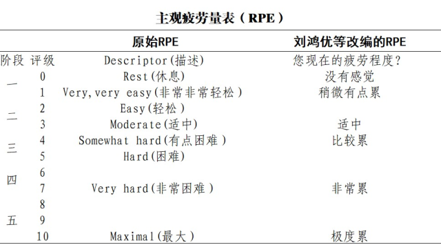 使用主觀疲勞感知評(píng)估量表,作為逐步提高活動(dòng)水平的指南。該量表是世界衛(wèi)生組織在《新冠病毒相關(guān)疾病康復(fù)指導(dǎo)手冊(cè)》對(duì)感染后患者通過(guò)記錄日常活動(dòng)以及主觀疲勞量表評(píng)分(RPE值)來(lái)監(jiān)控自身的狀況,并用于指導(dǎo)如何提高自身活動(dòng)水平的量表。該量表將運(yùn)動(dòng)中主觀感受的費(fèi)力程度劃分為0分(完全不費(fèi)力)到10分(最大程度的用力),即RPE值0~10分。