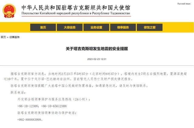 央視網(wǎng)消息:中國駐塔吉克斯坦大使館2月23日發(fā)布關(guān)于塔吉克斯坦發(fā)生地震的安全提醒。