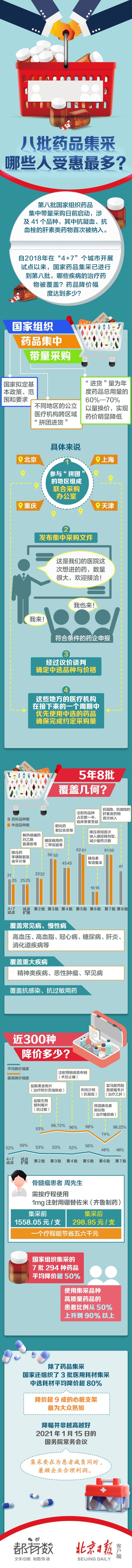 自2018年在“4+7”個城市開展試點以來,國家藥品集采已進行到第八批,哪些疾病的治療藥物被覆蓋?藥品降價幅度達到多少?