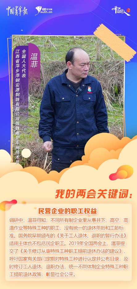 民營企業(yè)的職工權(quán)益,一直是溫菲關(guān)注的焦點(diǎn)。調(diào)研中,溫菲得知,不同所有制企業(yè)里從事井下、高空、高溫作業(yè)等特殊工種的職工,沒有統(tǒng)一的退休年齡和工齡標(biāo)準(zhǔn)。國務(wù)院早期頒布的《關(guān)于工人退休、退職的暫行辦法》適用主體也不包括民企職工。2019年全國兩會(huì)上,溫菲提交了《關(guān)于修訂從事特殊工種職工提前退休辦法的建議》,呼吁國家有關(guān)部門定期對(duì)特殊工種進(jìn)行認(rèn)定并公布目錄,及時(shí)修訂工人退休、退職辦法,統(tǒng)一不同體制企業(yè)特殊工種職工提前退休政策,彰顯社會(huì)公平。