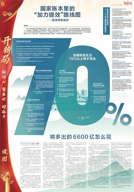 3月7日,《中國青年報》兩會特刊推出可視化版面解讀預(yù)算報告中的重要數(shù)據(jù)“70%”——連續(xù)5年全國財政支出70%以上用于民生。通過突出這一大數(shù)據(jù),凸顯本屆政府執(zhí)政為民的理念。整版通過數(shù)據(jù)的變化,解讀預(yù)算報告,呈現(xiàn)“積極財政政策提力增效的路線圖”。