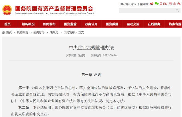 2022年,國資委印發(fā)《中央企業(yè)合規(guī)管理辦法》。管理辦法在充分借鑒世界一流企業(yè)先進(jìn)經(jīng)驗的基礎(chǔ)上,明確提出中央企業(yè)應(yīng)當(dāng)結(jié)合實際設(shè)立首席合規(guī)官,不新增領(lǐng)導(dǎo)崗位和職數(shù),由總法律顧問兼任,對企業(yè)主要負(fù)責(zé)人負(fù)責(zé),領(lǐng)導(dǎo)合規(guī)管理部門組織開展相關(guān)工作,指導(dǎo)所屬單位加強合規(guī)管理。(記者王希)