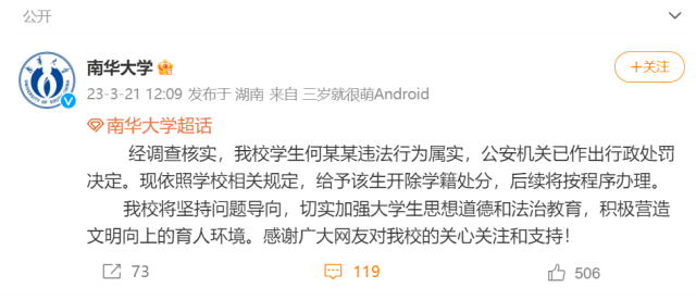 央視網(wǎng)消息:據(jù)@南華大學(xué) 微博最新消息,經(jīng)調(diào)查核實,該校學(xué)生何某某違法行為屬實,公安機關(guān)已作出行政處罰決定。現(xiàn)依照學(xué)校相關(guān)規(guī)定,給予該生開除學(xué)籍處分,后續(xù)將按程序辦理。