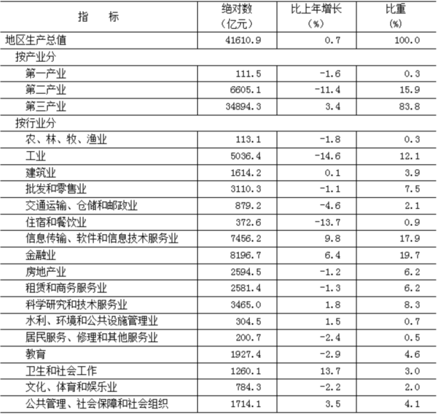 初步核算,全年實現(xiàn)地區(qū)生產(chǎn)總值41610.9億元,按不變價格計算,比上年增長0.7%。其中,第一產(chǎn)業(yè)[2]增加值111.5億元,下降1.6%;第二產(chǎn)業(yè)增加值6605.1億元,下降11.4%;第三產(chǎn)業(yè)增加值34894.3億元,增長3.4%。三次產(chǎn)業(yè)構成為0.3︰15.9︰83.8。按常住人口計算,全市人均地區(qū)生產(chǎn)總值為19.0萬元。
