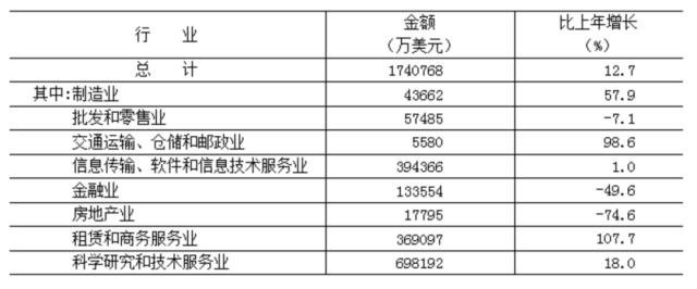全年實際利用外商直接投資174.1億美元,按可比口徑[8]計算,比上年增長12.7%。其中,科學研究和技術服務業(yè)69.8億美元,占40.1%,增長18.0%;信息傳輸、軟件和信息技術服務業(yè)39.4億美元,占22.7%,增長1.0%;租賃和商務服務業(yè)36.9億美元,占21.2%,增長1.1倍。