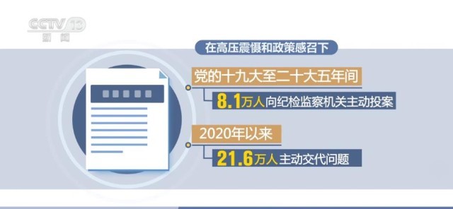 在高壓震懾和政策感召下,黨的十九大至二十大五年間,8.1萬人向紀(jì)檢監(jiān)察機(jī)關(guān)主動(dòng)投案,2020年以來,21.6萬人主動(dòng)交代問題。