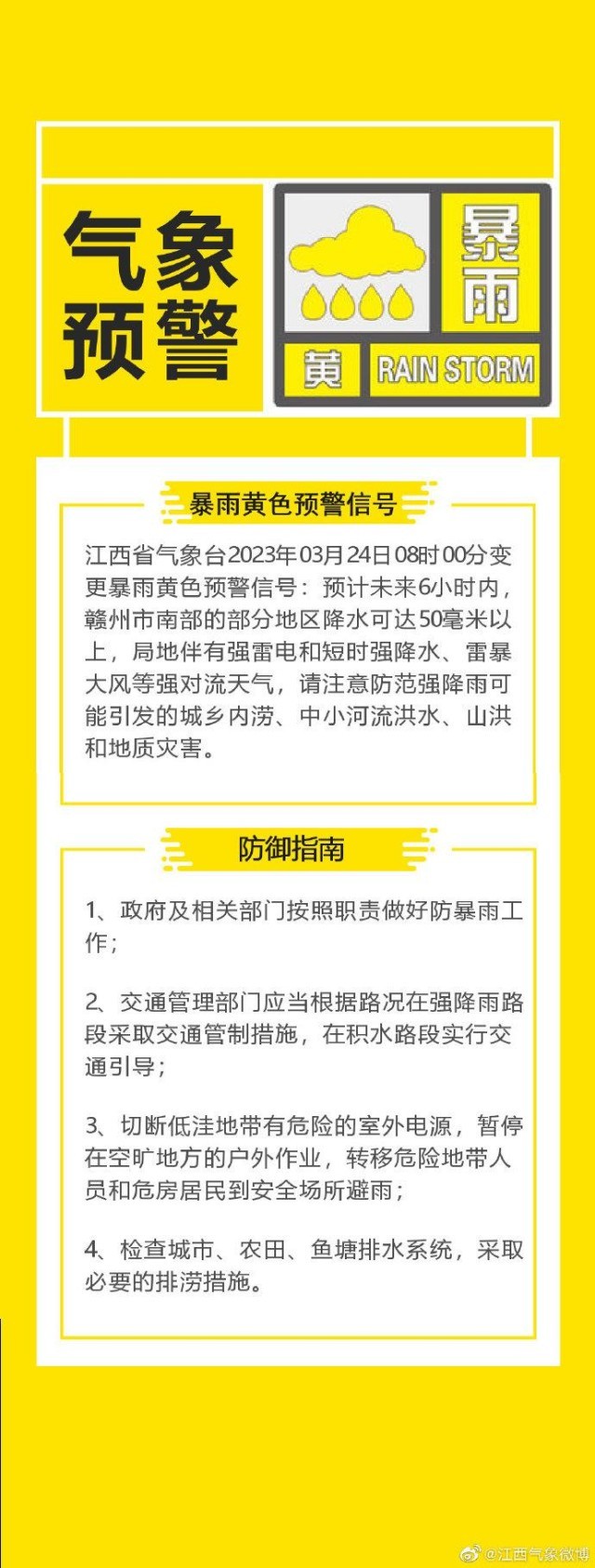 江西省氣象臺(tái)2023年03月24日08時(shí)00分變更暴雨黃色預(yù)警信號(hào):預(yù)計(jì)未來6小時(shí)內(nèi),贛州市南部的部分地區(qū)降水可達(dá)50毫米以上,局地伴有強(qiáng)雷電和短時(shí)強(qiáng)降水、雷暴大風(fēng)等強(qiáng)對(duì)流天氣,請(qǐng)注意防范強(qiáng)降雨可能引發(fā)的城鄉(xiāng)內(nèi)澇、中小河流洪水、山洪和地質(zhì)災(zāi)害。