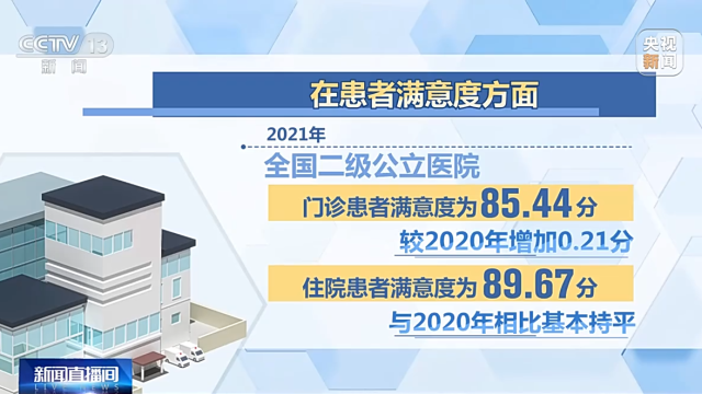 在患者滿意度方面,2021年,全國二級公立醫(yī)院門診患者滿意度為85.44分,較2020年增加0.21分,住院患者滿意度為89.67分,與2020年相比基本持平。