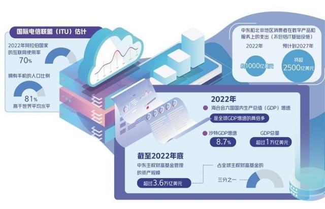 其次,中東消費者對互聯(lián)網(wǎng)、大數(shù)據(jù)、金融科技、新能源等高科技產(chǎn)品和服務(wù)有著旺盛需求,而且有較高的收入水平和支付能力。據(jù)國際電信聯(lián)盟(ITU)估計,2022年阿拉伯國家的互聯(lián)網(wǎng)使用率達(dá)70%,擁有手機的人口比例為81%,高于世界平均水平(73%)。據(jù)估計,2022年,中東和北非地區(qū)消費者在數(shù)字產(chǎn)品和服務(wù)上的支出(不包括IT基礎(chǔ)設(shè)施)約為1000億美元,預(yù)計到2027年將超過2500億美元。