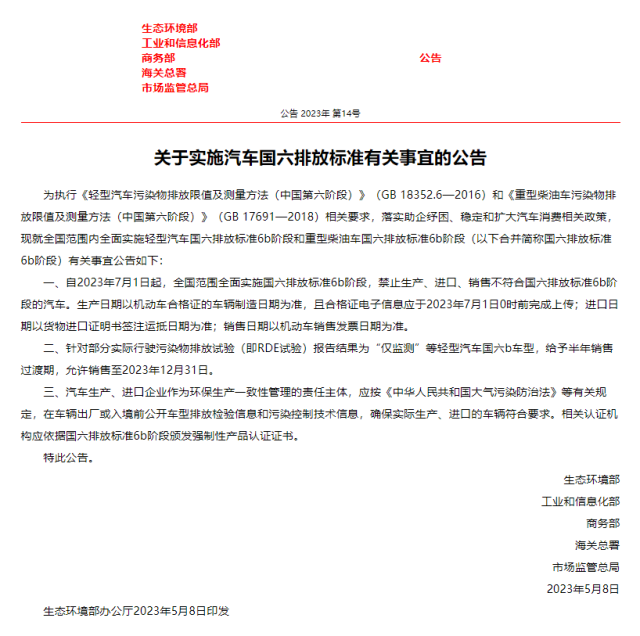 生態(tài)環(huán)境部辦公廳2023年5月8日印發(fā)關(guān)于實施汽車國六排放標(biāo)準(zhǔn)有關(guān)事宜的公告:
