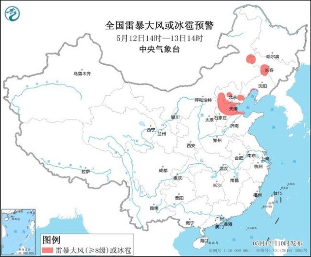 預(yù)計5月12日14時至13日14時,河北中部和東北部、北京西北部和南部、天津南部、吉林中西部、遼寧西北部、山東北部等地的部分地區(qū)將有8-10級雷暴大風(fēng)或冰雹天氣;吉林中部、遼寧西部、河北中北部、北京西北部、天津南部、山東北部、四川南部、云南南部、廣西東南部、廣東西南部、海南島等地的部分地區(qū)將有短時強降水天氣,小時雨量20-40毫米,局地可達50毫米以上。