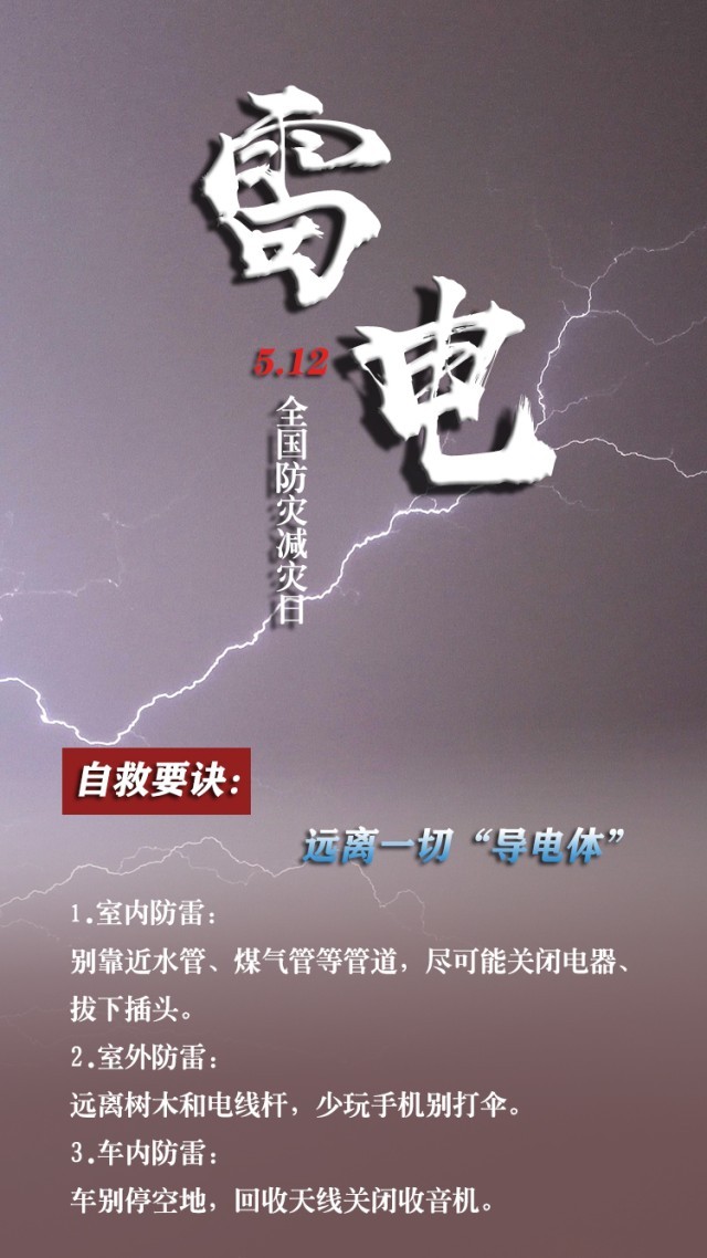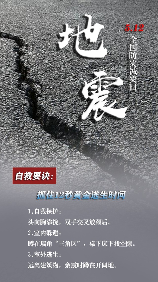 今天是第15個(gè)全國防災(zāi)減災(zāi)日。自然災(zāi)害隨時(shí)可能發(fā)生,及時(shí)自救才更有生存希望。地震來時(shí),如何抓住12秒黃金逃生時(shí)間?發(fā)生火災(zāi)時(shí),如何躲避火場濃煙?暴雨天如何安全出行?沙塵天氣如何做好防護(hù)……這份實(shí)用避險(xiǎn)口訣簡單好記,請(qǐng)速速收藏。