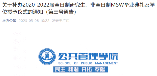 5月8日,華南農(nóng)業(yè)大學(xué)公共管理學(xué)院發(fā)布通知,決定為2020-2022屆全日制研究生、非全日制MSW補辦畢業(yè)典禮及學(xué)位授予儀式,畢業(yè)典禮及學(xué)位授予儀式以預(yù)約方式報名參加,時間定于5月20日(周六)。