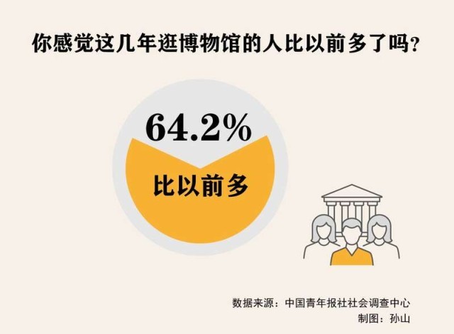 中青報社調(diào)中心的調(diào)查也顯示,超六成(64.2%)受訪者感覺這幾年逛博物館的人比以前多了。七成多(73.2%)受訪者表示去外地游玩,會把目的地博物館納入必到之地。