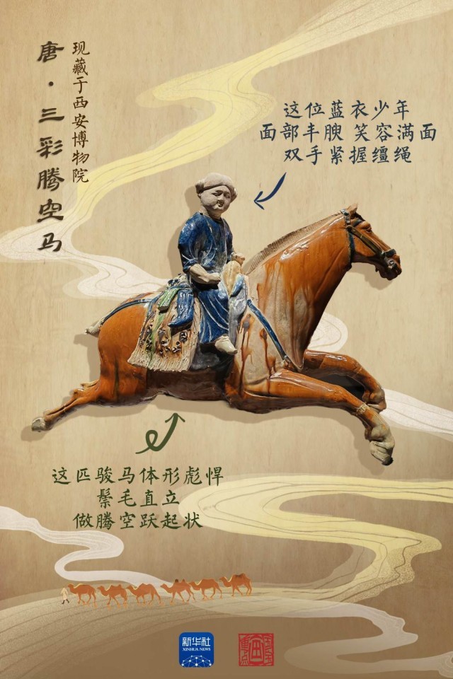 1000多年前,一位來自西域的“藍(lán)衣少年”,穿過茫茫戈壁、廣袤沙漠,抵達(dá)長(zhǎng)安。這位“藍(lán)衣少年”,是西安博物院“明星”藏品——唐代三彩騰空馬之上的騎手。“他”,也見證了這場(chǎng)跨越千年的文明交融。