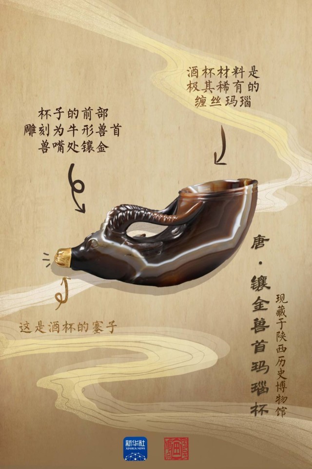 這件鑲金獸首瑪瑙杯,被列為我國禁止出境的珍貴文物之一。角狀杯體由一整塊極為罕見的紅色纏絲瑪瑙雕琢而成,整個(gè)杯體高6.5厘米,長(zhǎng)15.6厘米,口徑5.6厘米,其造型與起源于古希臘的酒具“來通”相似,“來通”曾廣泛流行于中亞、西亞地區(qū),沿著絲綢之路不斷東傳進(jìn)入中國。