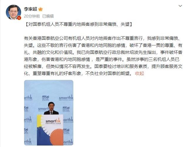李家超表示,他已向國泰航空行政總裁林紹波提出,此次事件屬于嚴(yán)重事件,國泰航空需進(jìn)行檢討,類似情況不容再次發(fā)生。