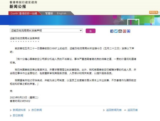 香港運(yùn)輸及物流局局長林世雄23日晚間發(fā)布聲明表示,十分痛心國泰航空公司部分機(jī)組人員的不當(dāng)言論,事件嚴(yán)重違背香港優(yōu)良的待客之道、一貫的價(jià)值觀和道德標(biāo)準(zhǔn)。