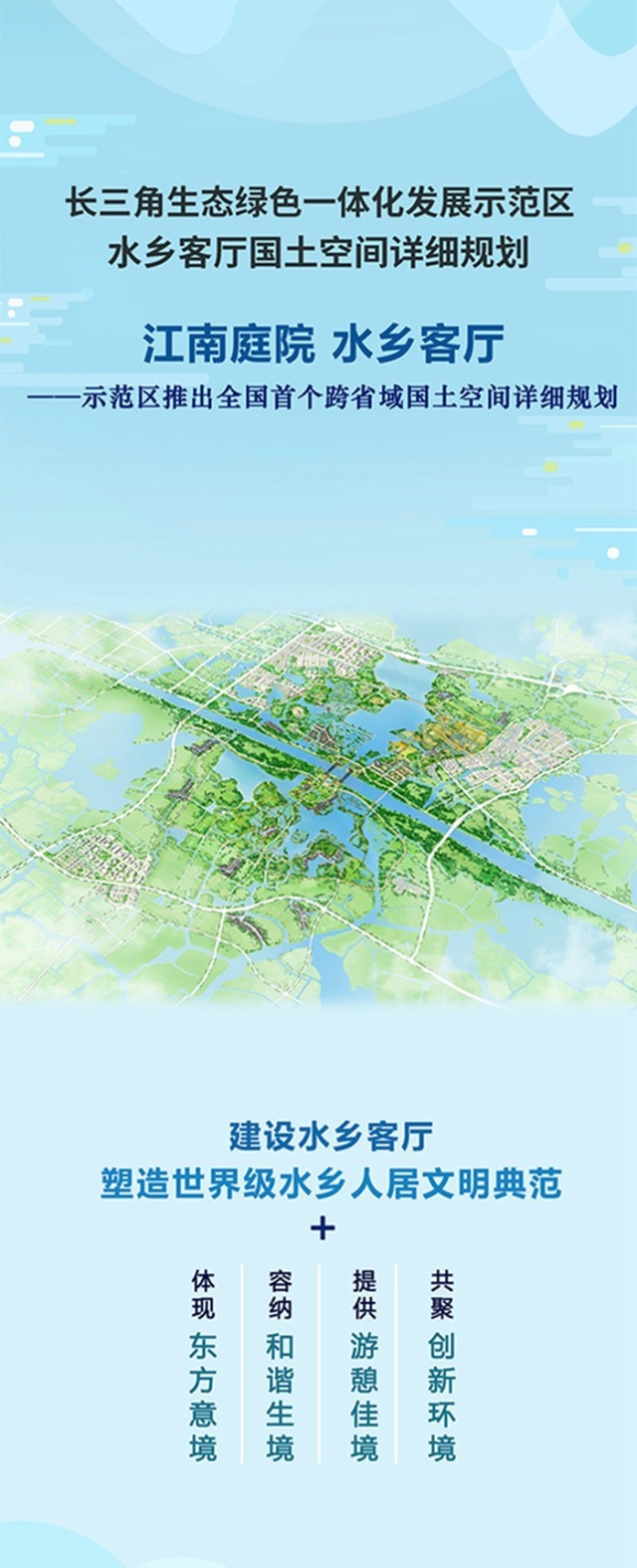 5月24日上午,在上海舉行了長三角一體化示范區(qū)水鄉(xiāng)客廳國土空間詳細規(guī)劃新聞發(fā)布會,會上發(fā)布了《長三角生態(tài)綠色一體化發(fā)展示范區(qū)水鄉(xiāng)客廳國土空間詳細規(guī)劃(2021-2035年)》,這也是全國首個跨省域的國土空間詳細規(guī)劃。水鄉(xiāng)客廳國土空間詳細規(guī)劃共13章、45節(jié),并包含了42張圖集以及詳細圖則,未來示范區(qū)將如何建設(shè)水鄉(xiāng)客廳?一圖詳解
