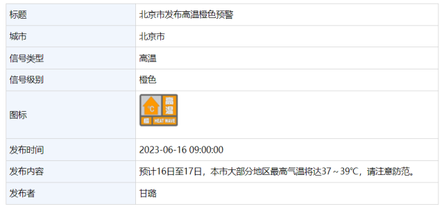 北京市氣象臺今天(16日)9時升級發(fā)布高溫橙色預警信號:預計16日至17日,北京市大部分地區(qū)最高氣溫將達37~39℃,請注意防范。