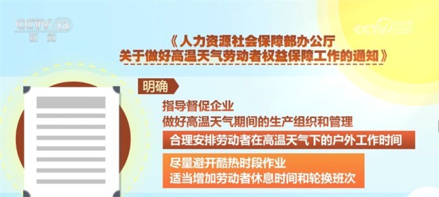 《通知》明確,指導(dǎo)督促企業(yè)做好高溫天氣期間的生產(chǎn)組織和管理,合理安排勞動者在高溫天氣下的戶外工作時間,盡量避開酷熱時段作業(yè),適當(dāng)增加勞動者休息時間和輪換班次。